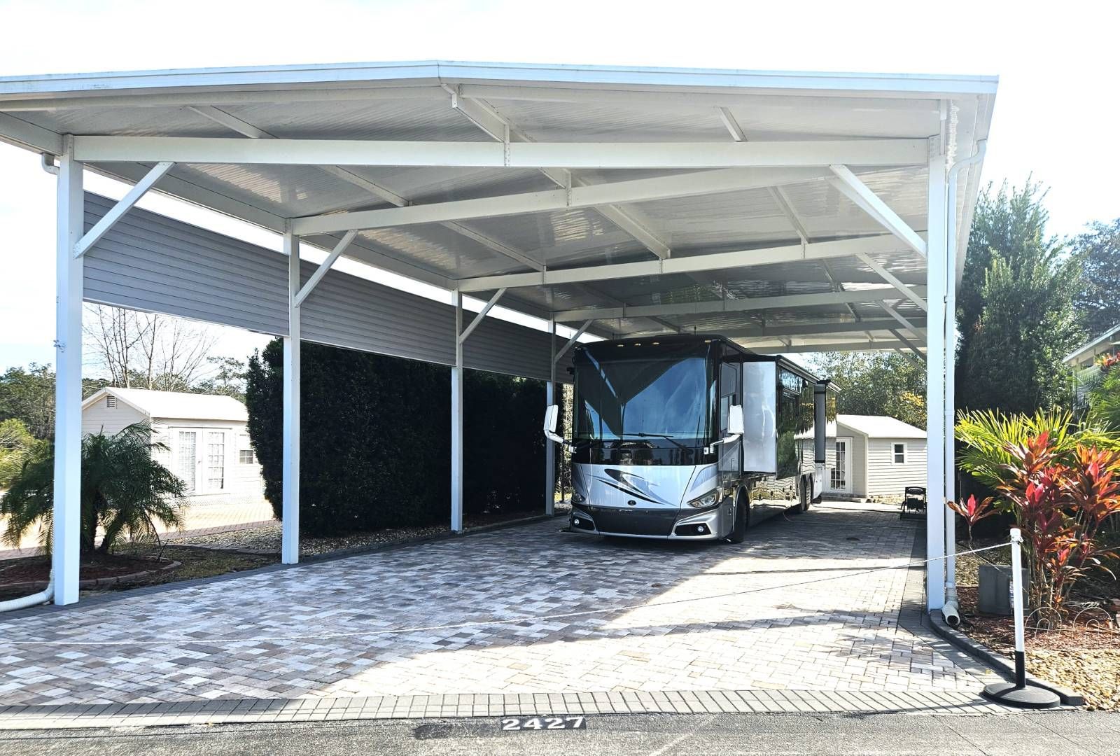 If you've been searching for an outstanding spot for your Class A RV, look no further! 2427 St George Dr, located in the 55+ Regal Pointe Community at Deer Creek, has everything you've been looking for and more. Overall, the property is over 4,140 sq ft, already developed with an oversized 27' x 80 RV port, goregous upgraded pavers, irrigation system, and even a 10' x 12' utility shed in place, all just waiting for you to back your RV in, connect to full 50 amp service, and relax! The lot backs up to a wooded area at the backside of the property, providing great privacy while enjoying your time outside. The Regal Pointe Community is exclusively for Class A RV's, as well as site-built homes. Available to the residents is a beautiful clubhouse, heated pool, workout room, laundry center, and many planned seasonal activities. This is a golf cart friendly community, with quick easy access to restaurants, banks and shopping. Amenities include golf, tennis, pickleball, shuffleboard, driving range, tiki bar, and many planned seasonal activities are available. **...As a sidenote...the adjacent property (2421 St George Dr) is also for sale, making this the perfect scenario for someone searching for one lot for RV parking and the other for building a home or casita. Call or text today to view this great opportunity!