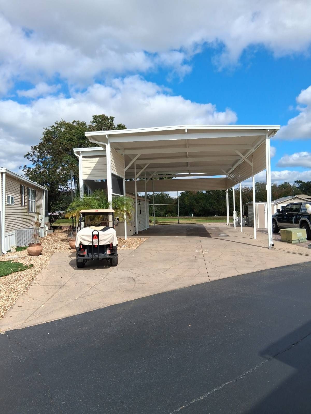 Details: Drastic Price Improvement. This is an Elegant 55+ Golf Course Retreat with Modern Upgrades & Resort-Style Amenities. Enjoy the benefit of land ownership as well here, NO LOT RENT, YOU OWN THE LAND. Welcome to this beautifully landscaped 1-bedroom, 2-bathroom home, offering 1,220 sq. ft. of thoughtfully designed living space right on the golf course, the 17th Hole ! This charming residence features stainless steel appliances, a stackable washer & dryer, and solar panels (2021) for energy efficiency. Two skylights flood the home with natural light, enhancing its inviting atmosphere. The interior boasts textured walls with elegant bullnosed corners, adding a sophisticated touch to the space. Constructed with quality in mind, the largest part of the home is wood-frame, providing durability and charm. Enjoy peace of mind with a durable shingled roof and a spacious 40-foot RV/carport (2019), designed to accommodate even large RVs. A highlight of this home is the Florida room which doubles as the guest room (2017), fully enclosed under central air, perfect for entertaining or even as a guest suite. Located in a gated community, residents enjoy pools, clubhouses, laundry facilities, tennis & pickleball courts, shuffleboard, and an 18-hole executive golf course. While the neighborhood offers excellent accommodations for RV owners, you do not need to own an RV to purchase in this community. Convenience is key—this home is just one mile from a variety of shopping, dining, and entertainment options, including big-box retailers, restaurants, and a movie theater. Plus, you're only 20 minutes from Disney, and 30 minutes from SeaWorld and Universal Studios, making it a prime location for both relaxation and adventure. Don’t miss this incredible opportunity—schedule your private tour today!